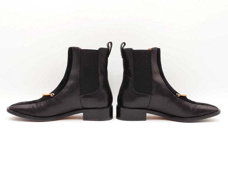 Tory Burch Equestrian Link Chelsea Black Leather & Suede Ankle Boots. Size US 6M. Style # 5595 G21. Good Pre-Owned Condition. Wear on insoles and soles. Wear and scuffs throughout leather and suede. Creasing in toe and heel areas. Scratches and scuffs on midsoles and heels. Backstay pulls are worn and cracking on the edges. 1-inch heel.